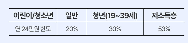 6~18세 어린이, 청소년도 이용이 가능하며, 연 24만원 한도내에서 분기별로 자동으로 환급됩니다.